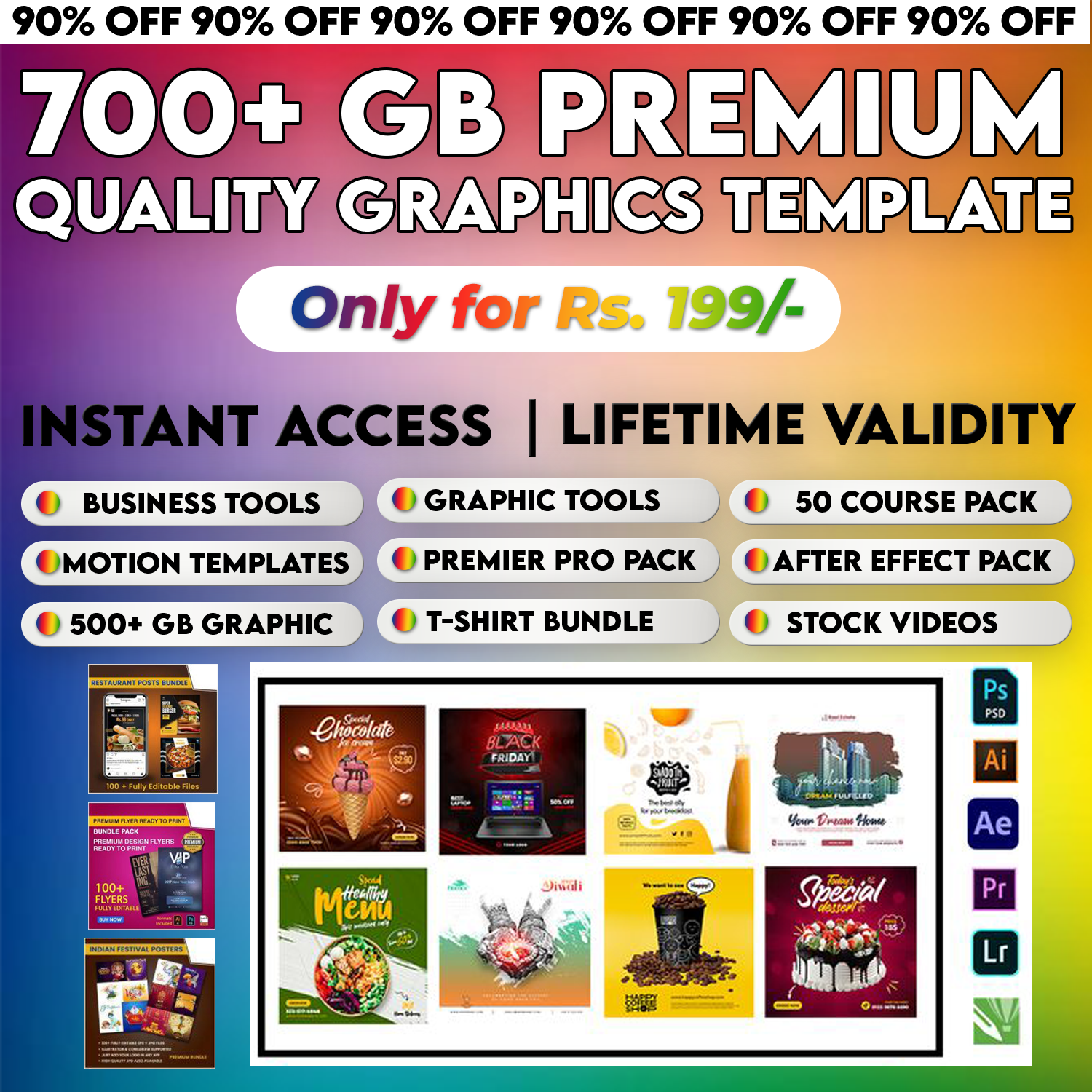 • Unleash your creativity with a colossal library of over 625 gigabytes of premium graphics. From striking illustrations and vibrant vectors to high-resolution images and captivating icons, this bundle is a comprehensive resource for all your design endeavors.